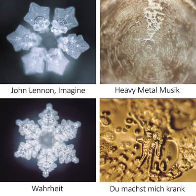 Wasser, welches negative Informationen ausgesetzt war, z.B. Wasser aus Flüssen, das schon durch mehrere Städte geflossen ist; Wasser welches mit Worten wie „Du machst mich krank,“ besprochen wurde oder Wasser, das mit Heavy Metal Musik bespielt wurde – dieses Wasser wies eine ungeordnete chaotische Struktur auf, welches an ein Krebsgeschwür erinnert. Hingegen bildete Wasser aus reinen Quellen, Wasser, das mit Worten wie „Liebe und Dankbarkeit“ besprochen wurde, sowie Wasser, das Musik, wie einer Symphonie von Beethoven ausgesetzt war, wunderschöne Kristalle.